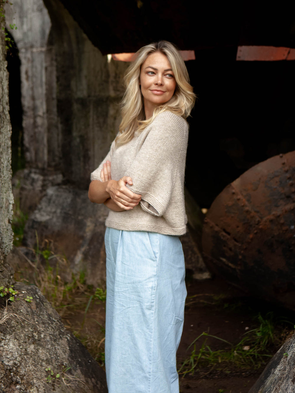 Pictured on our model Bridie in colour 'Barley' knitted in size Small, and colour 'Cinnamon' knitted in size XLarge.