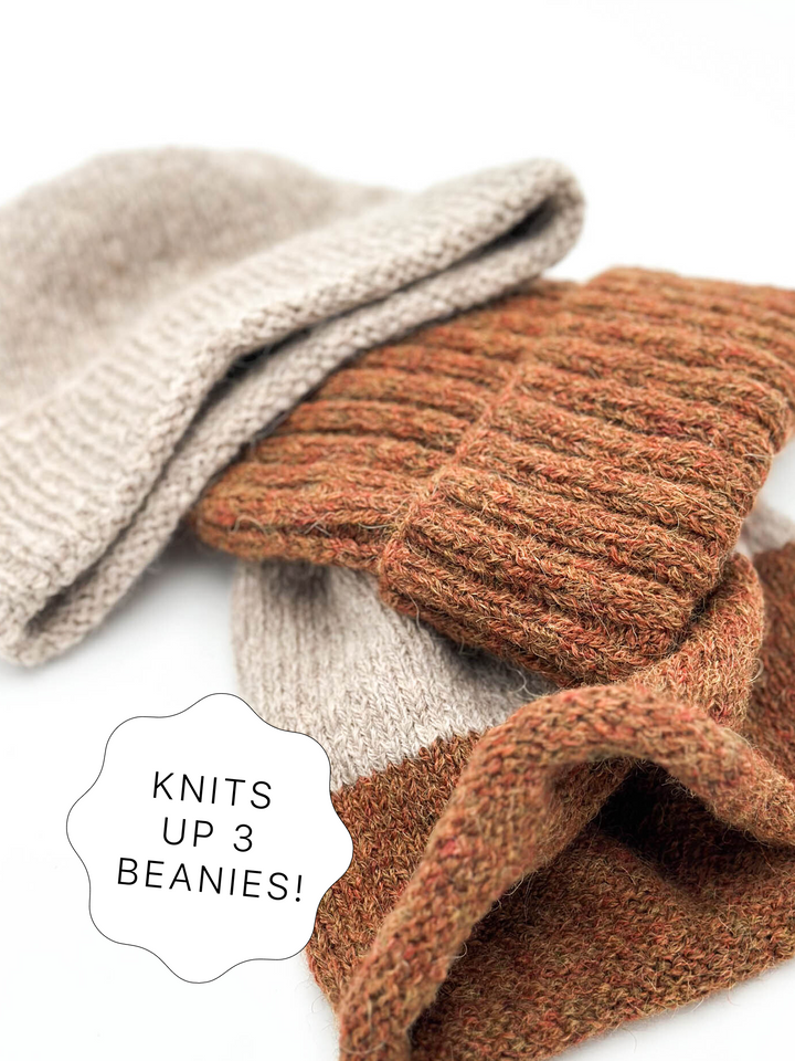 Includes 2 balls of each of two colours — enough to knit two single-colour beanies and one two-colour beanie.