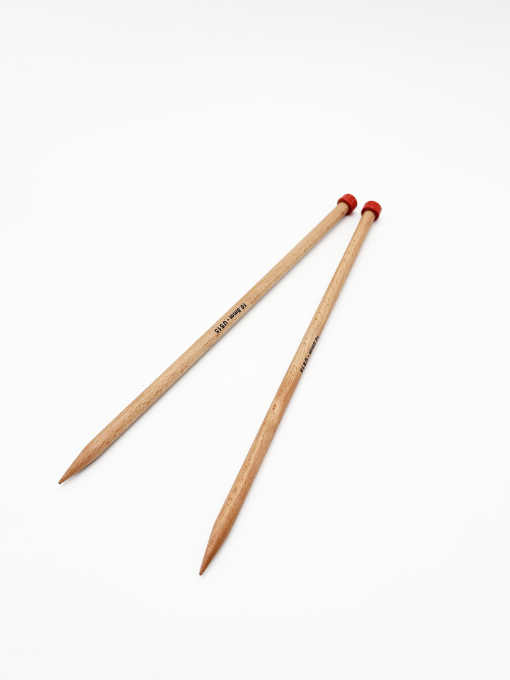 Single pointed straight needles in the size 10mm and length 30cm (US 15 / 12"). They have the lightness of beech and the strength of natural wood.